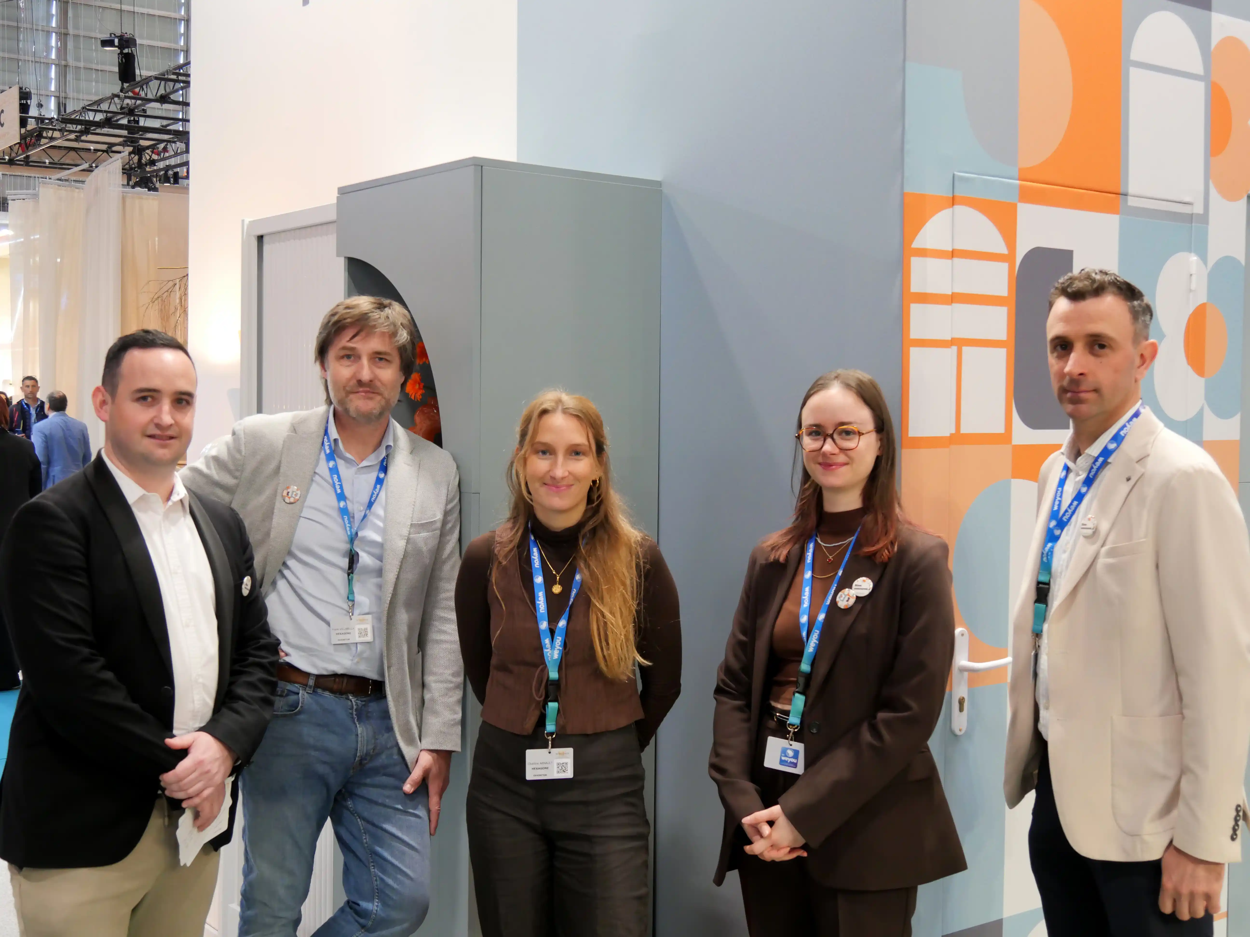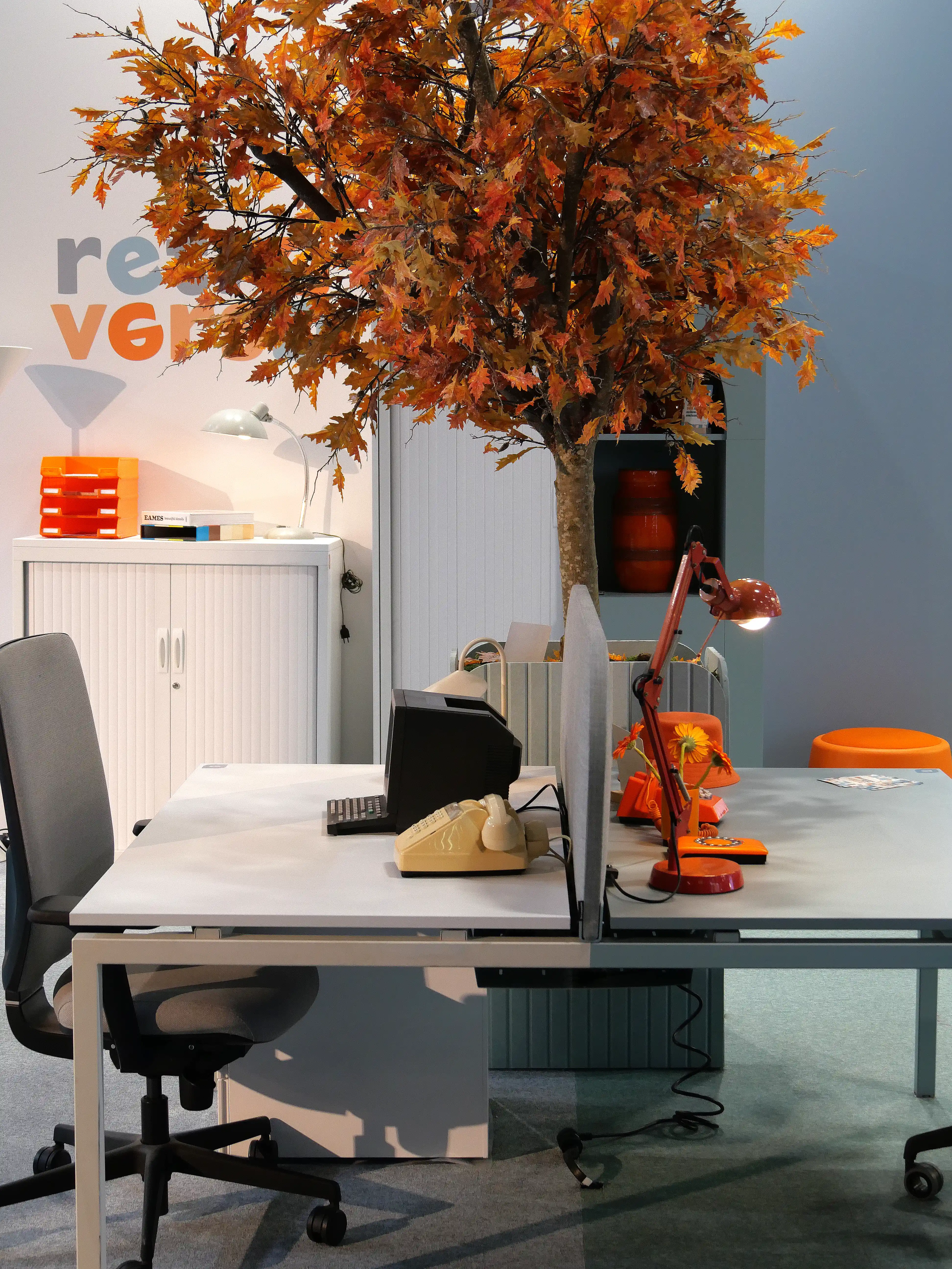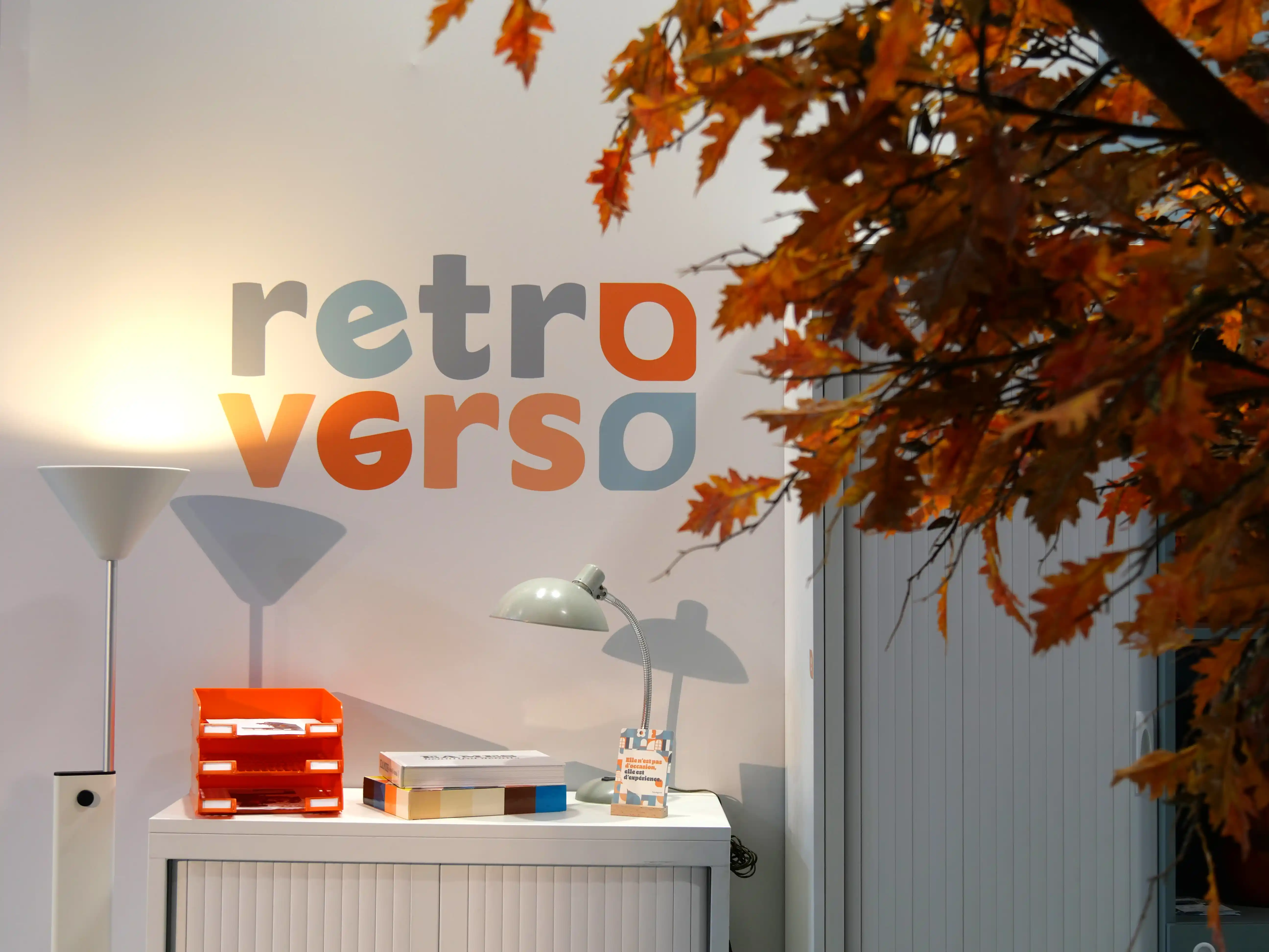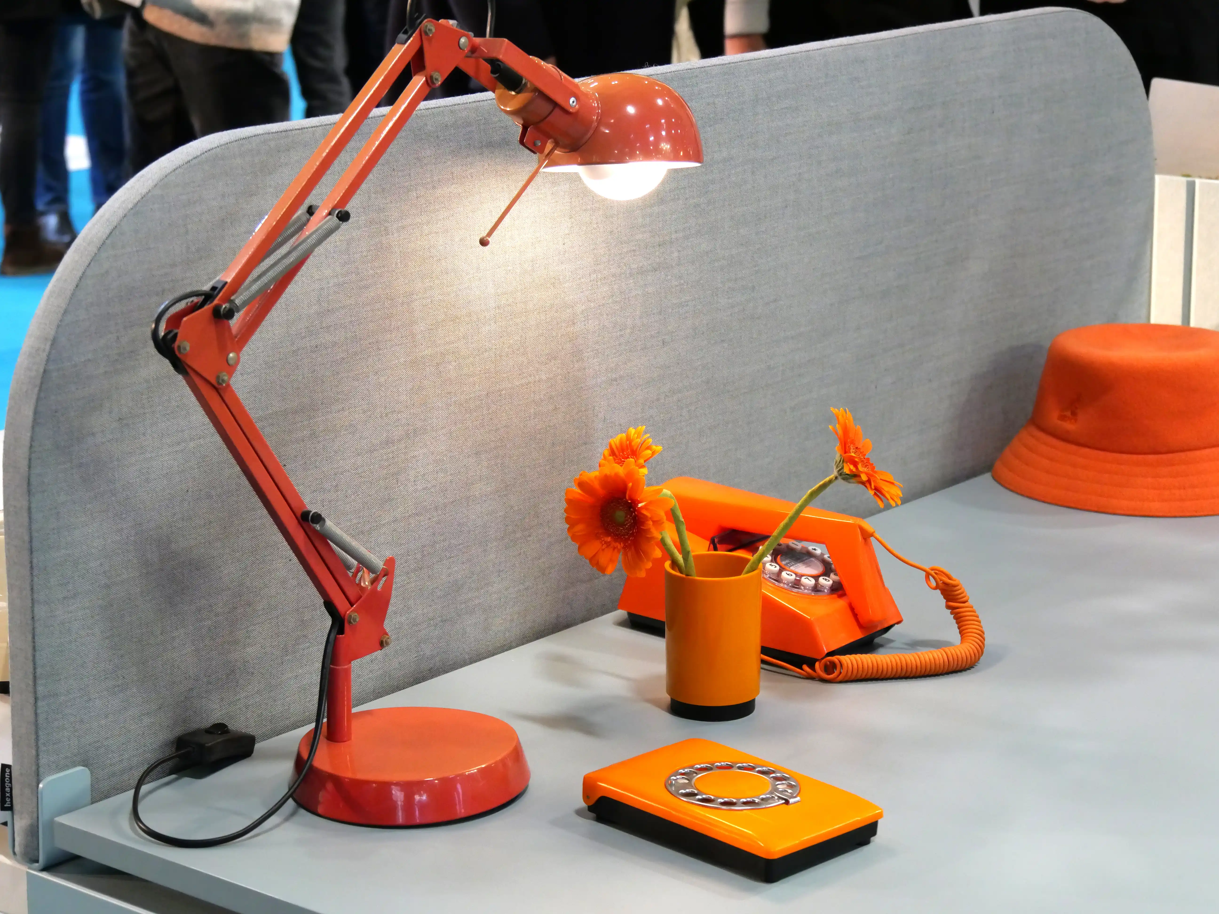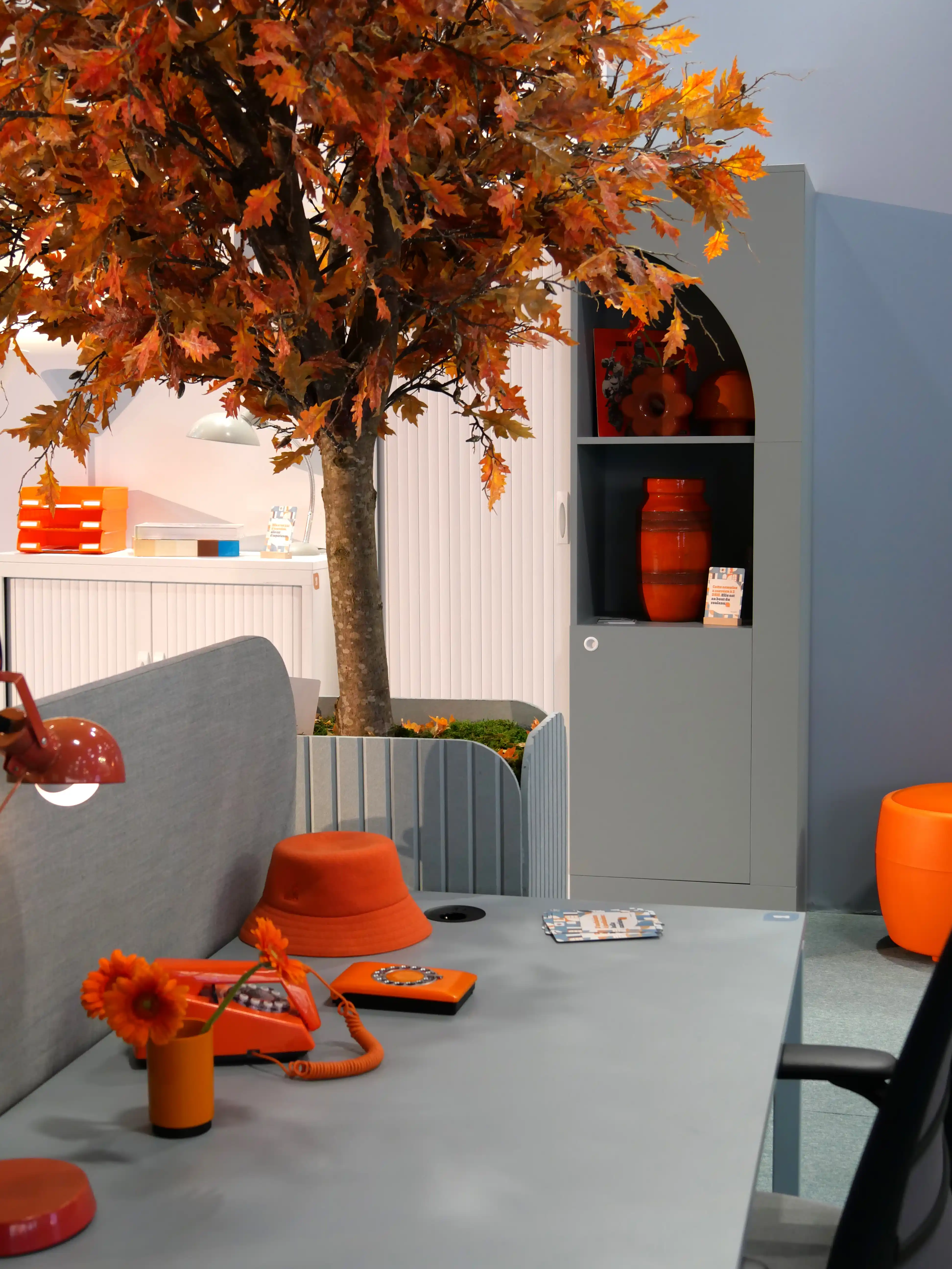 Le stand s’articule comme une opposition volontaire. D’un côté, une lecture presque figée du bureau d’hier, fonctionnelle, rationnelle. De l’autre, une ambiance inspirée des années 70, entre couleurs franches, matières expressives et clins d’œil assumés.